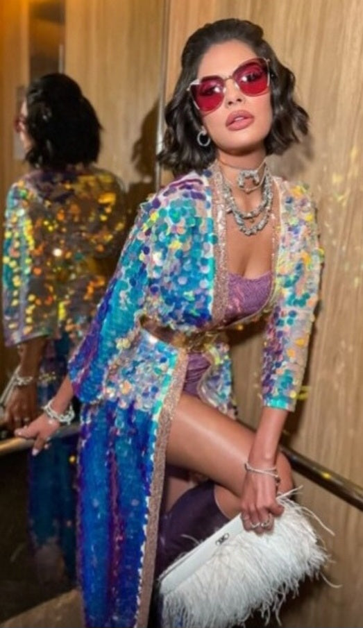 Le kimono porté par Miss Univers lors du défilé du Carnaval Brésil était un véritable chef-d'œuvre. Orné de très grandes paillettes irisées, le kimono scintillait sous les projecteurs, captivant le public du sambodrome. Chaque sequin a été méticuleusement placé pour créer un effet visuel fascinant qui met en valeur le savoir-faire et la vision artistique de Festivo Kimonos.